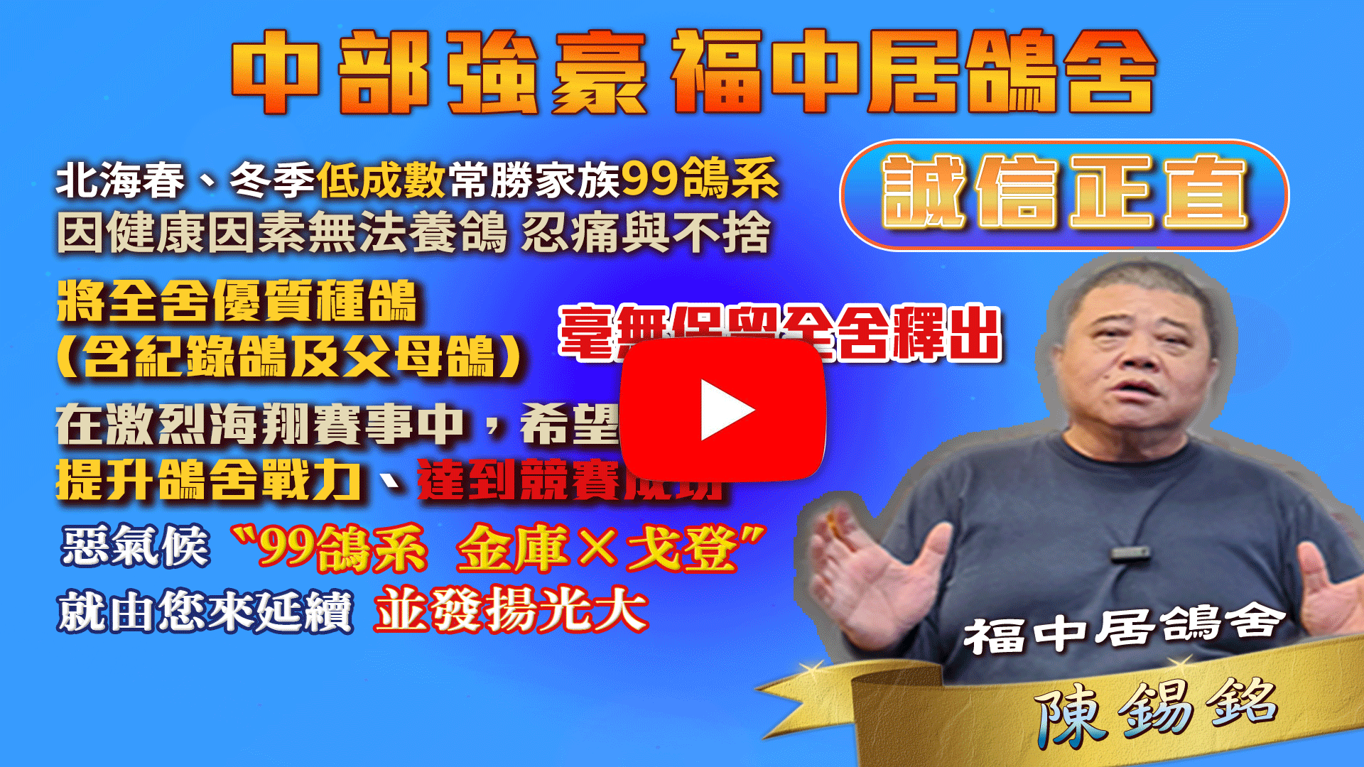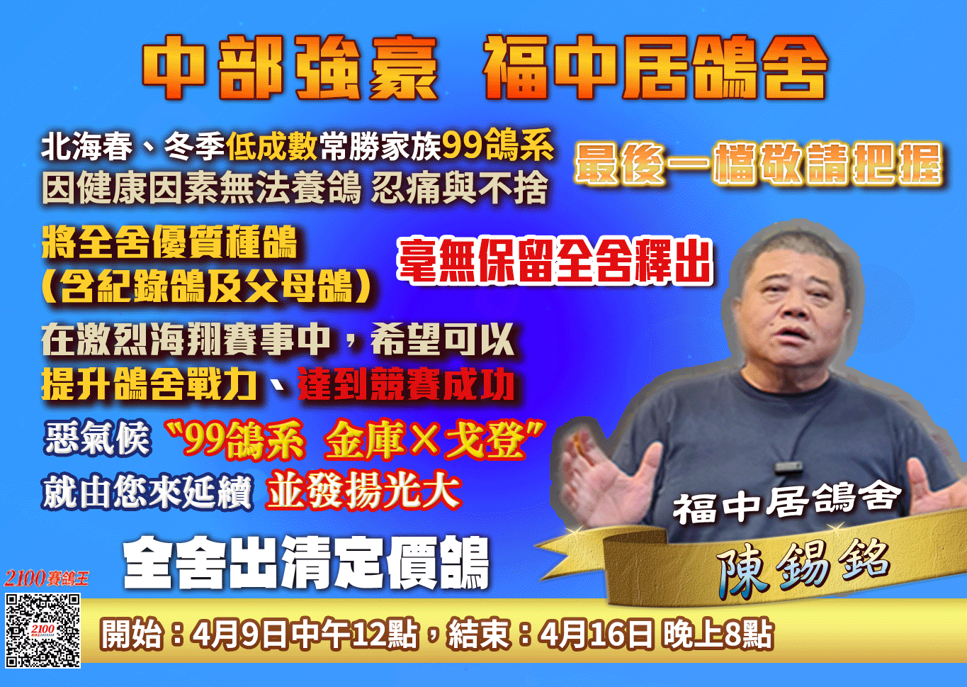 ◉拍賣|【金財神鴿舍】南北海翔常勝強豪|冠軍的創造者→開標:4月23日 中午12點,結標:4月27-29日 晚上8點起