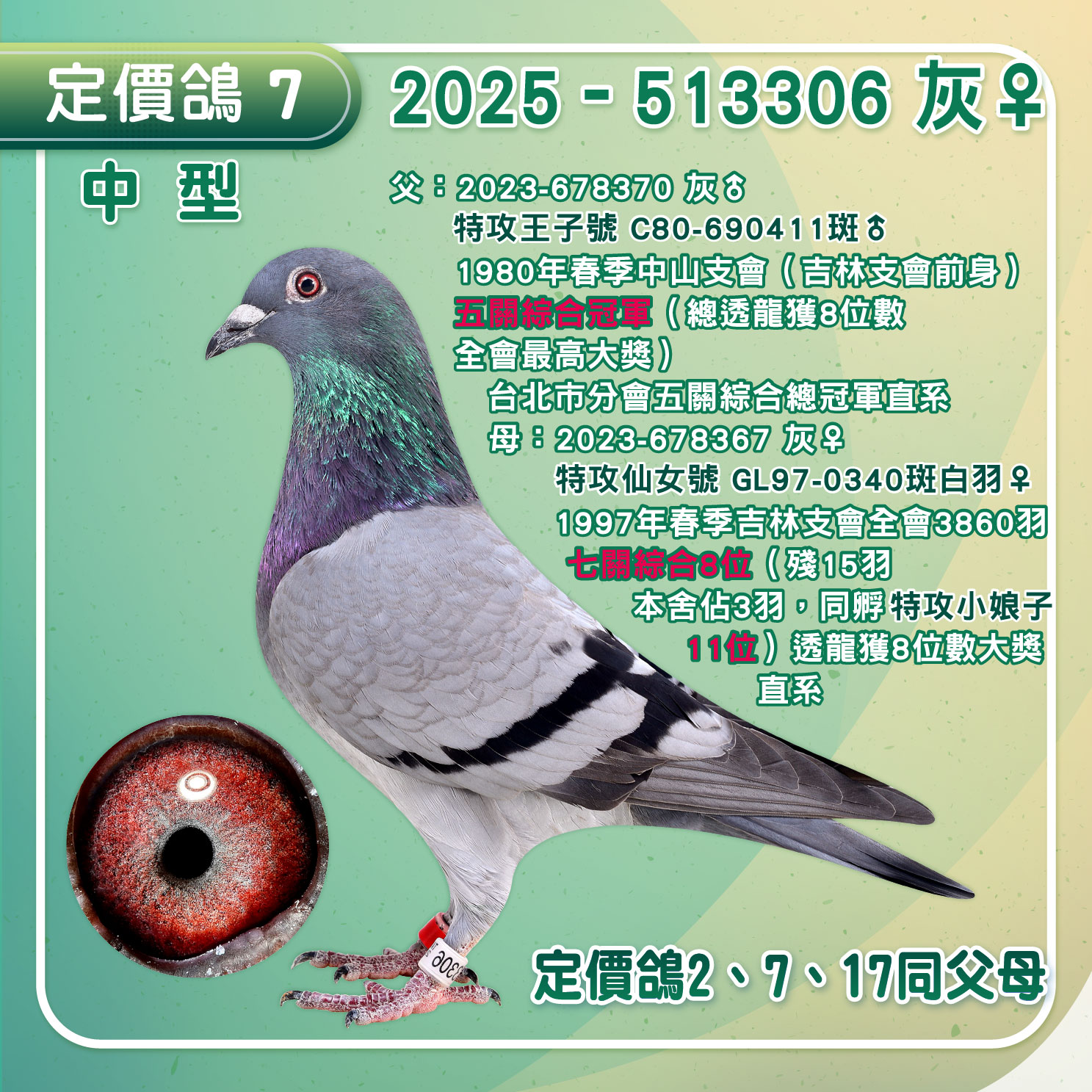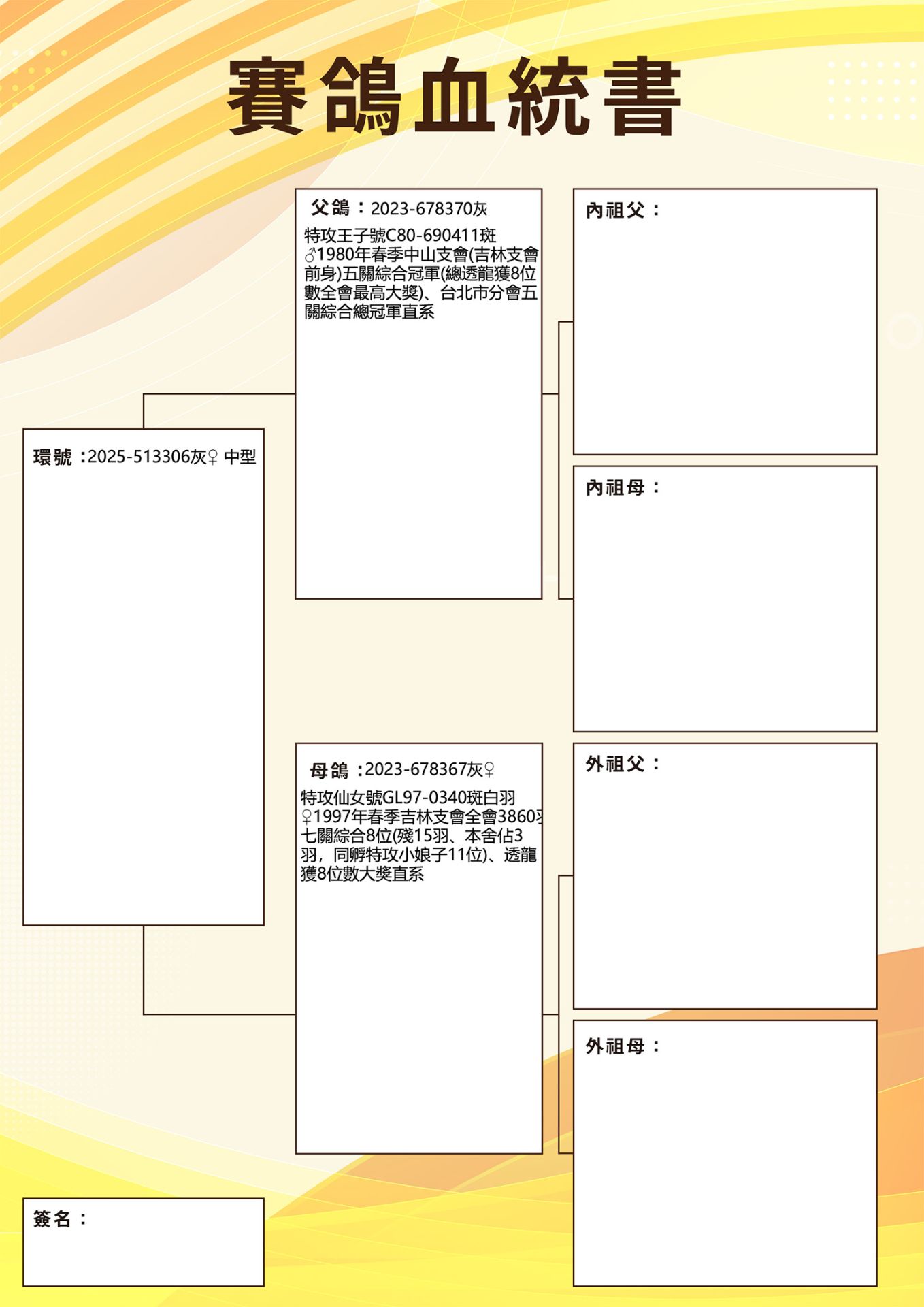 特攻仙女號 GL97-0340斑白羽♀ 1997年春季吉林支會全會3860羽七關綜合8位(殘15羽、本舍佔3羽,同孵特攻小娘子11位)、透龍獲8位數大獎直系