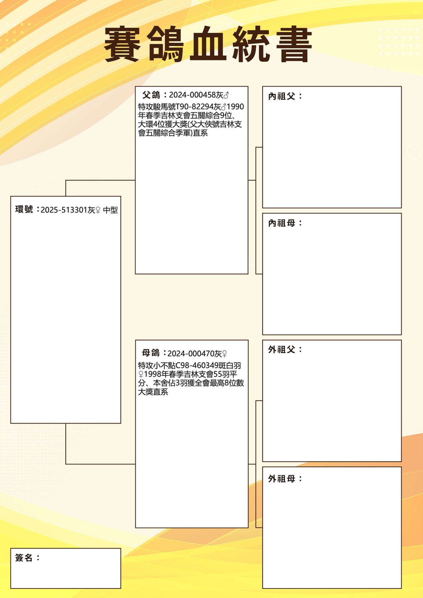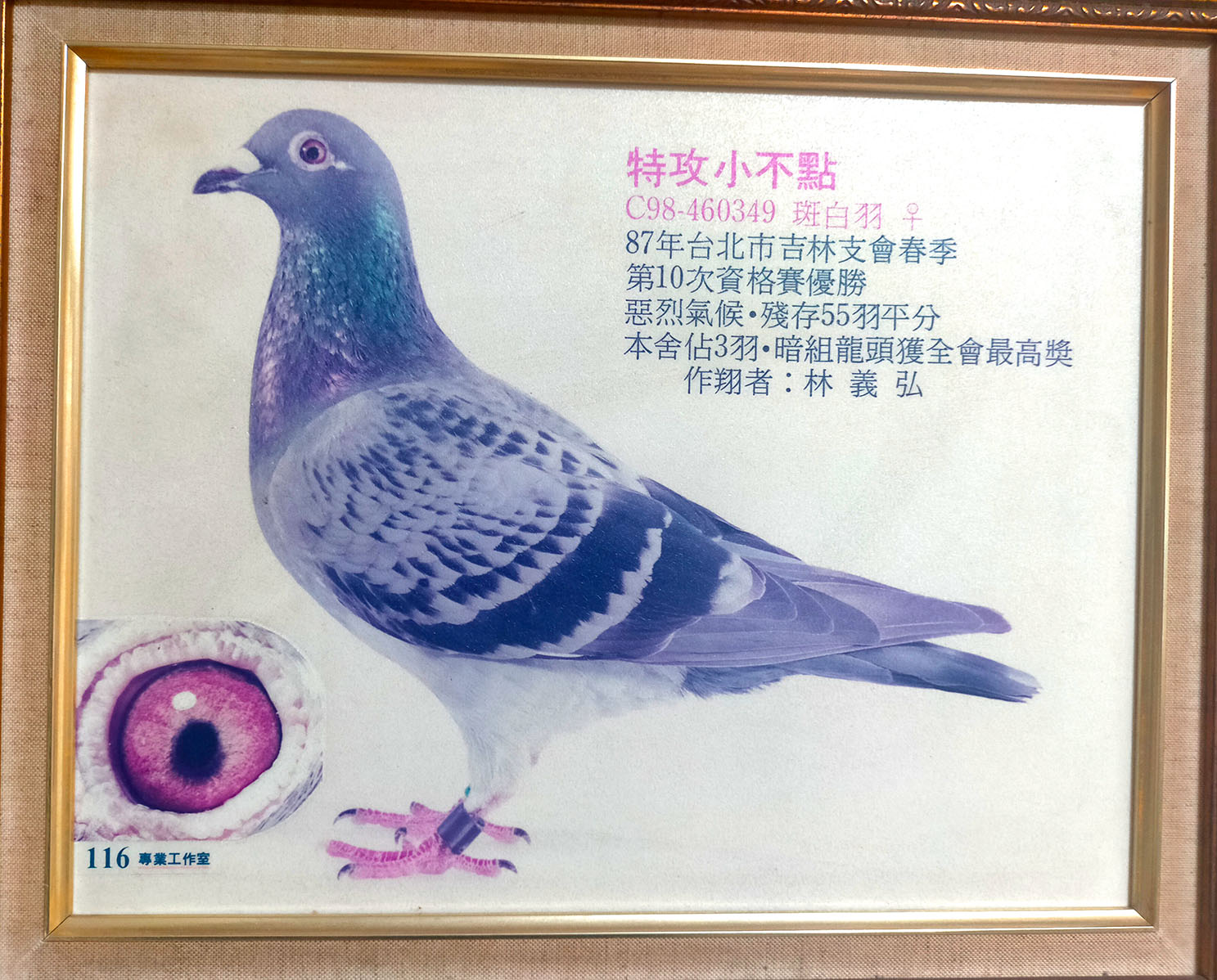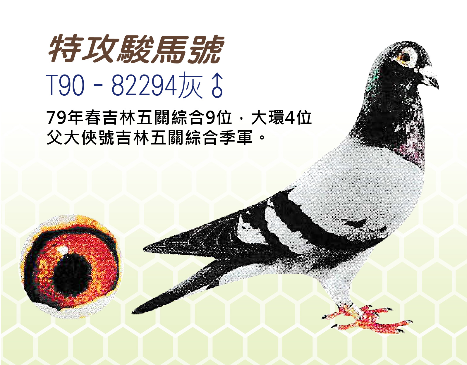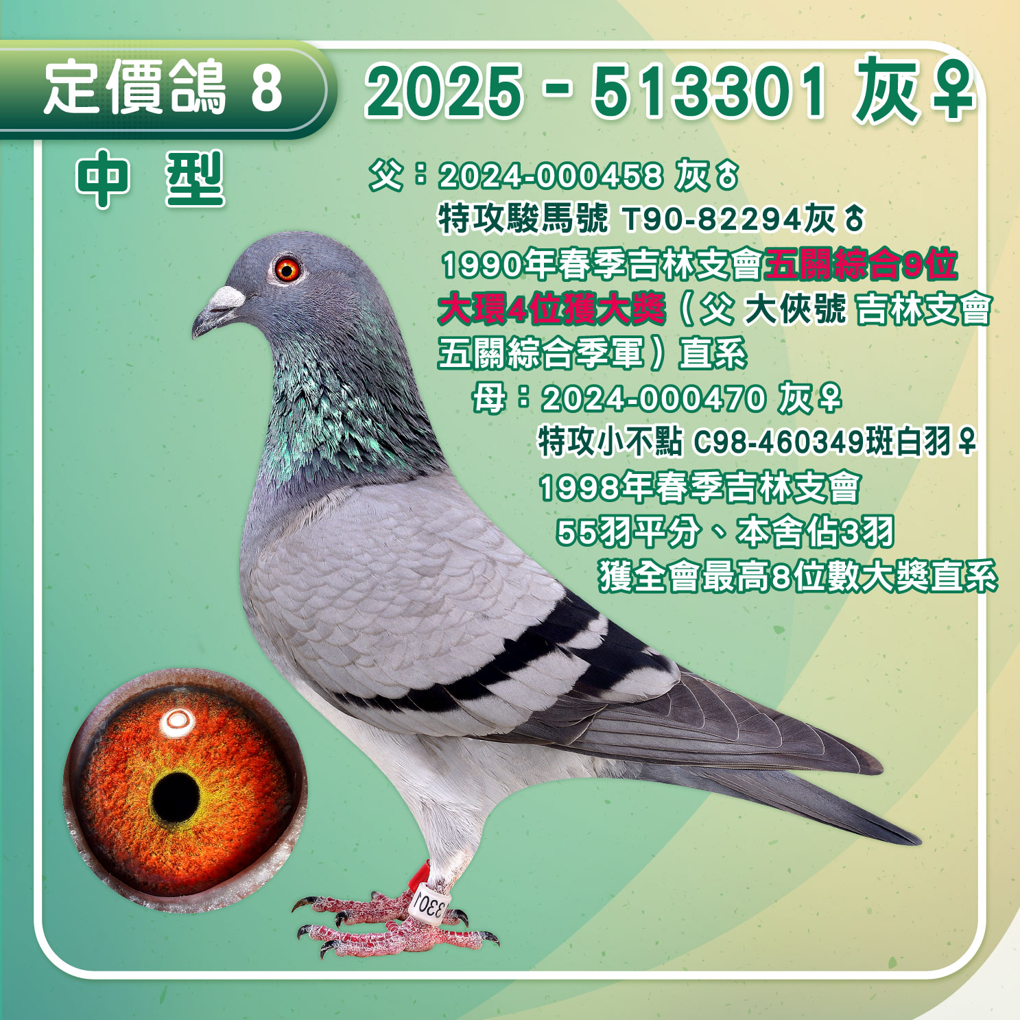 特攻小不點 C98-460349斑白羽♀ 1998年春季吉林支會55羽平分、本舍佔3羽獲全會最高8位數大獎直系