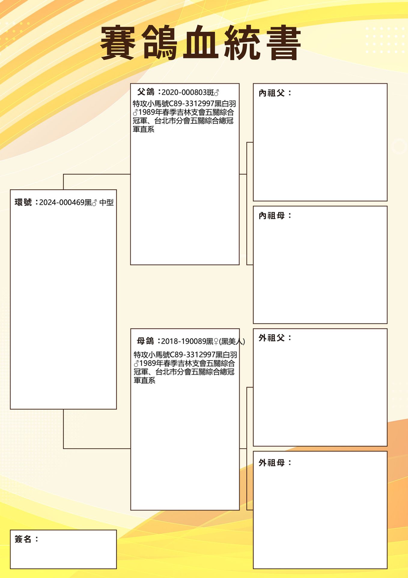 特攻小馬號 C89-3312997黑白羽♂ 1989年春季吉林支會五關綜合冠軍、台北市分會五關綜合總冠軍直系