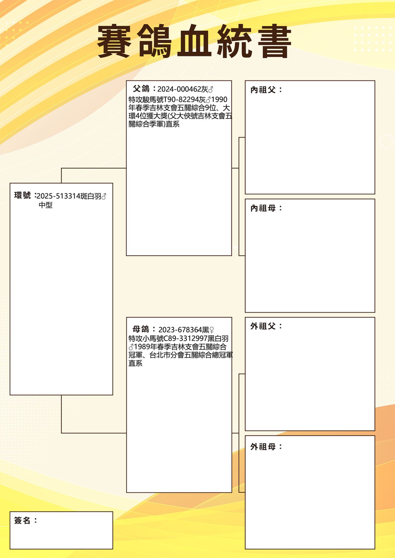 特攻小馬號 C89-3312997黑白羽♂ 1989年春季吉林支會五關綜合冠軍、台北市分會五關綜合總冠軍直系