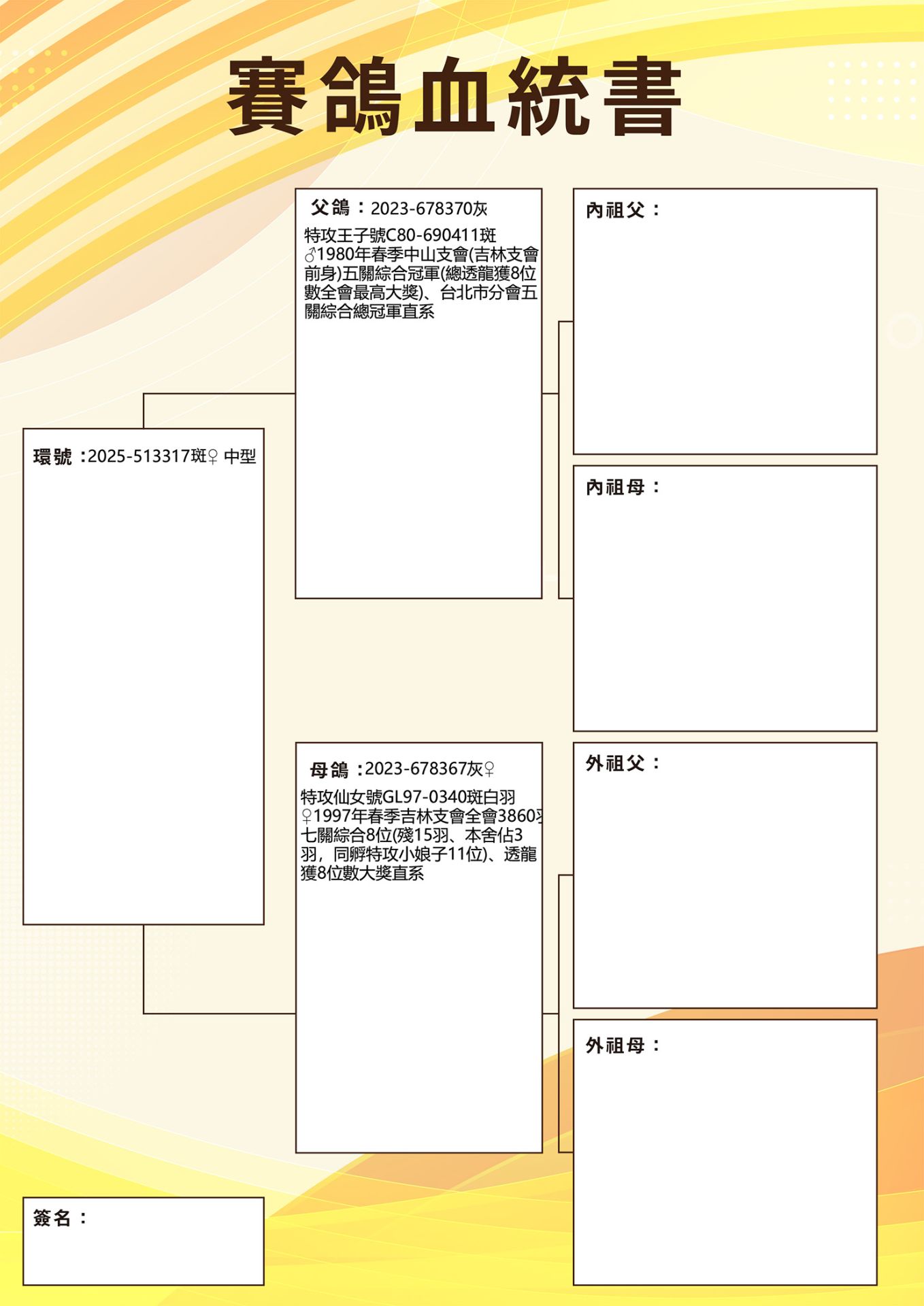 特攻仙女號 GL97-0340斑白羽♀1997年春季吉林支會全會3860羽七關綜合8位(殘15羽、本舍佔3羽,同孵特攻小娘子11位)、透龍獲8位數大獎直系