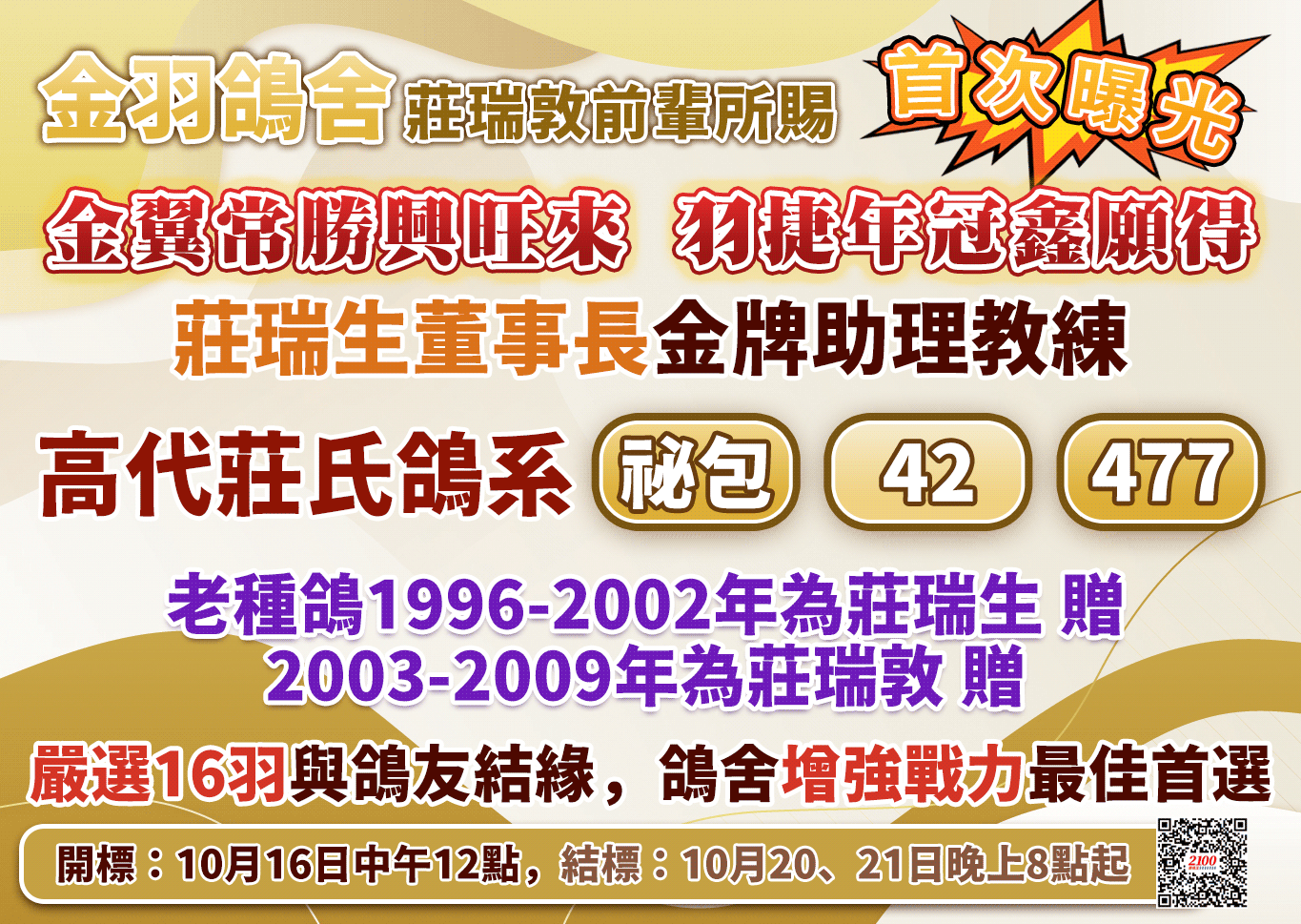 ◉拍賣|【金羽鴿舍】高代莊氏鴿系|祕包、42、477→開標:10月16日 中午12點,結標:10月20、21日 晚上8點