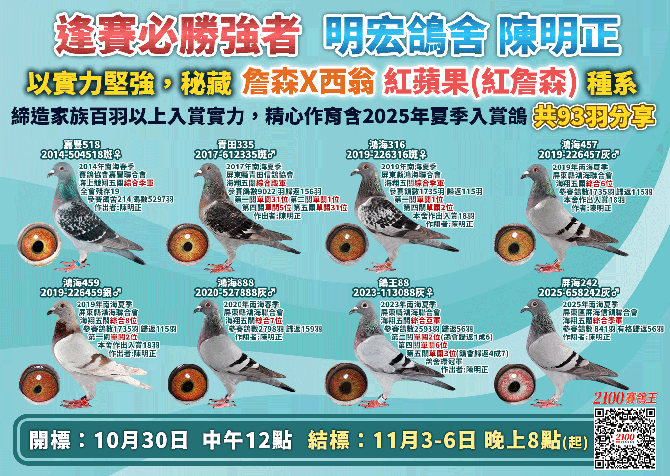◉拍賣|【明宏鴿舍】以實力堅強,秘藏詹森X西翁、紅蘋果(紅詹森)種系→開標:10月30日 中午12點,結標:11月3-6日 晚上8點起