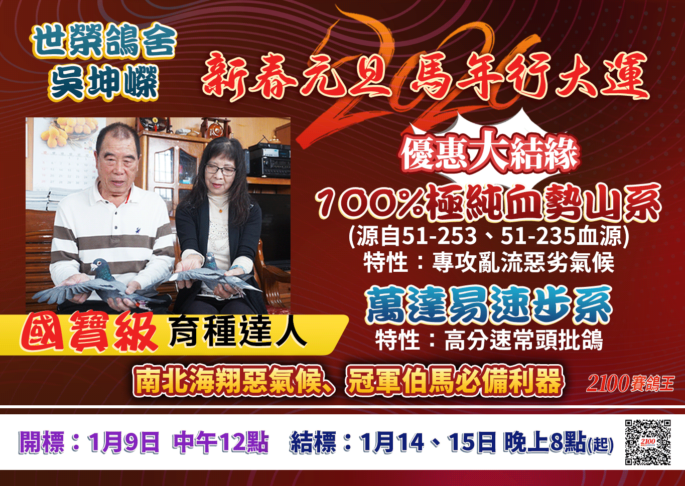 ◉拍賣|【世榮鴿舍】100%極純血勢山鴿系、萬達易速步系→開標:1月9日 中午12點,結標:1月14、15日 晚上8點起