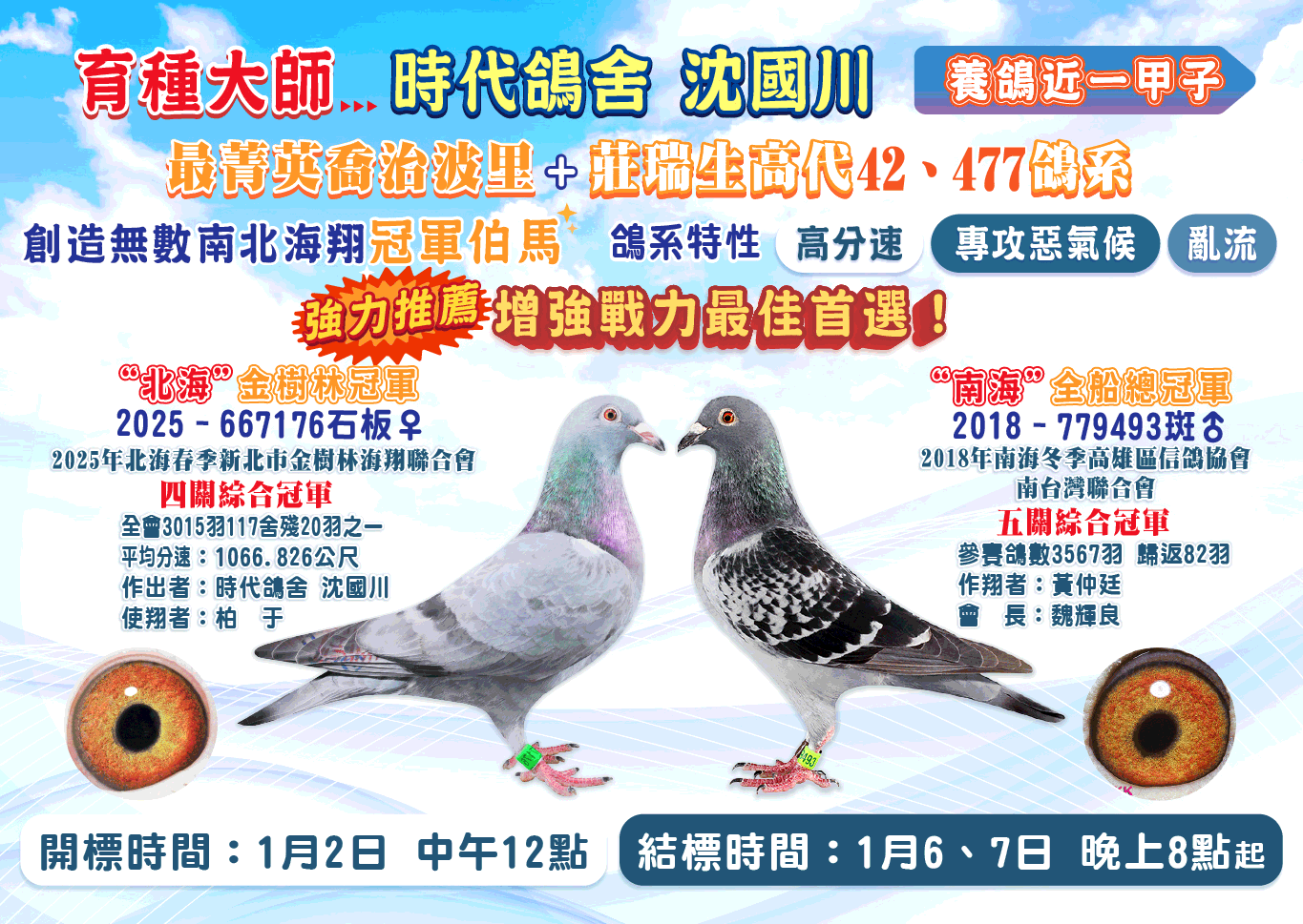 ◉拍賣|【時代鴿舍】養鴿近一甲子|最菁英喬治波里+莊瑞生高代42、477鴿系→開標:1月2日 中午12點,結標:1月6、7日 晚上8點起