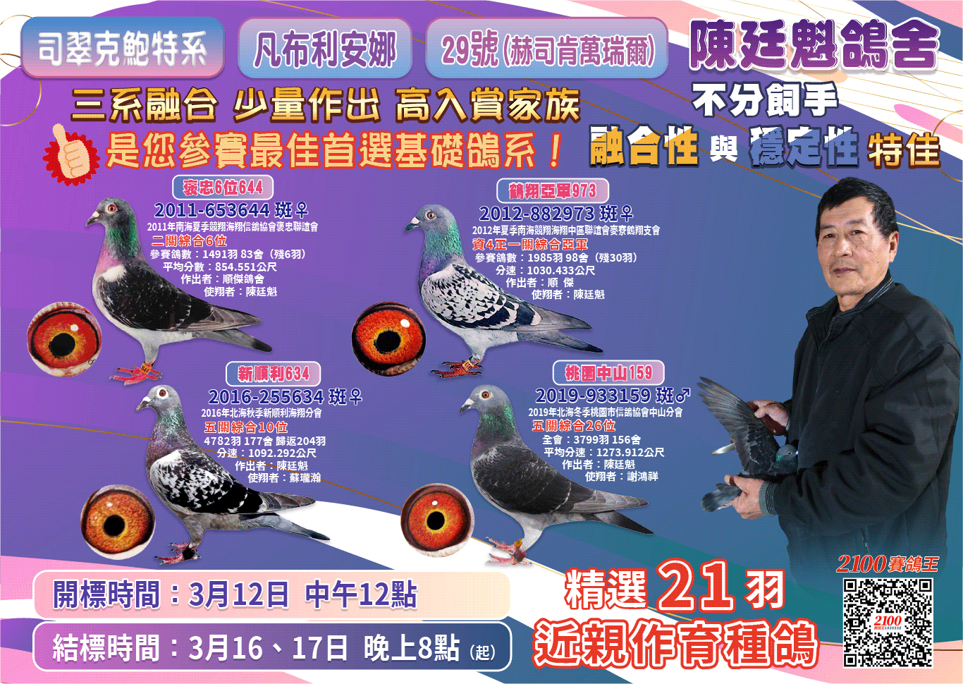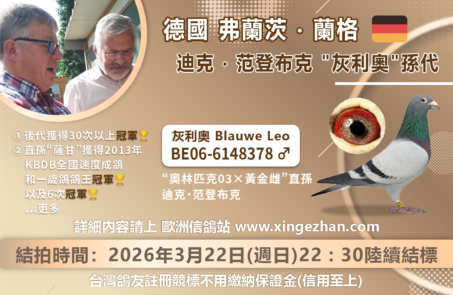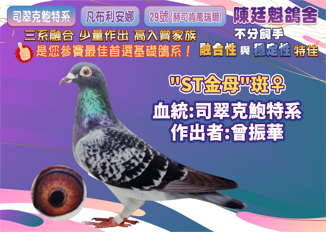◉拍賣|【陳廷魁鴿舍】司翠克鮑特系、凡布利安娜、29號(赫司肯萬瑞爾)|三系融合,少量作出,高入賞家族→開標:3月12日 中午12點,結標:3月16、17日 晚上8點起