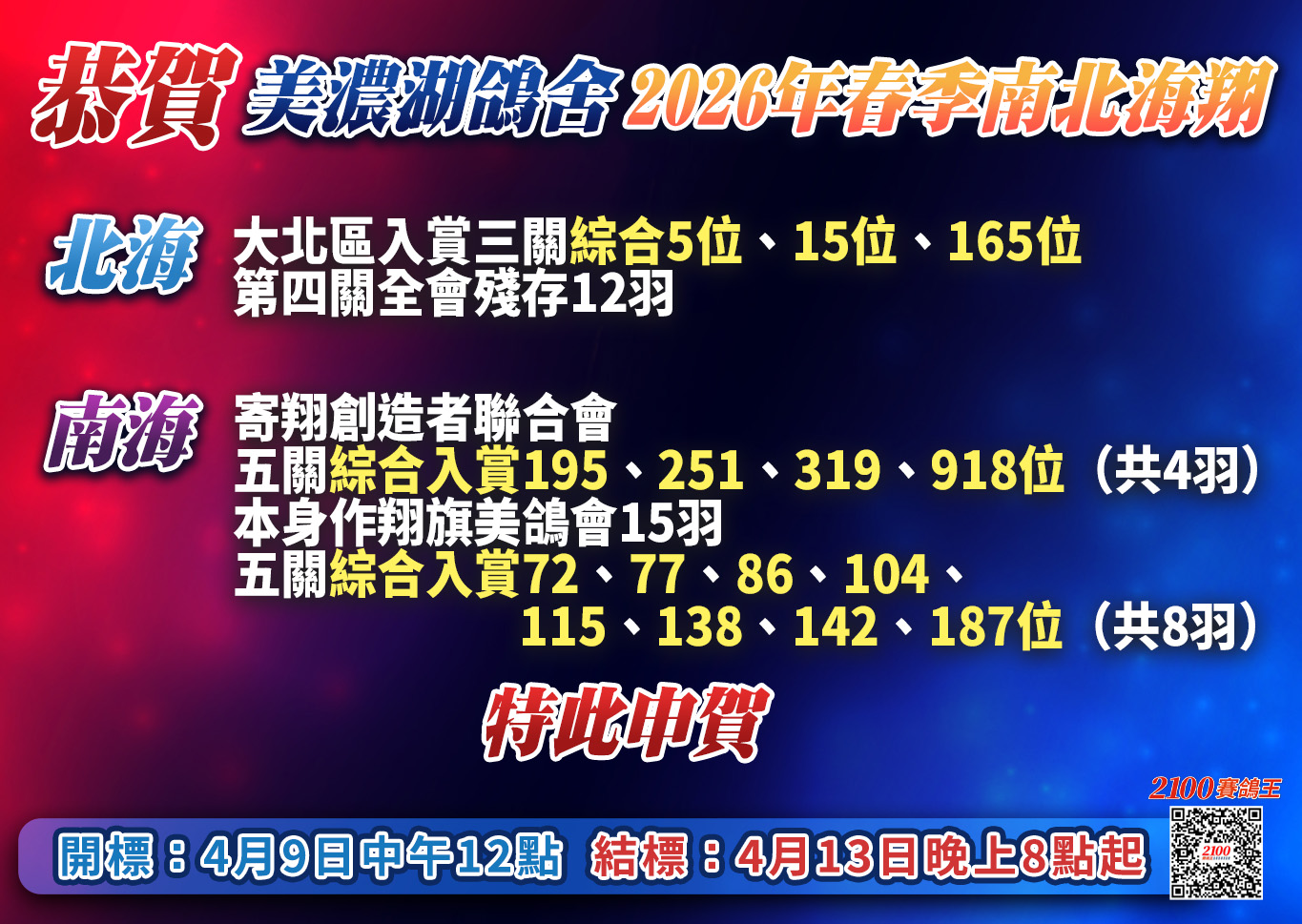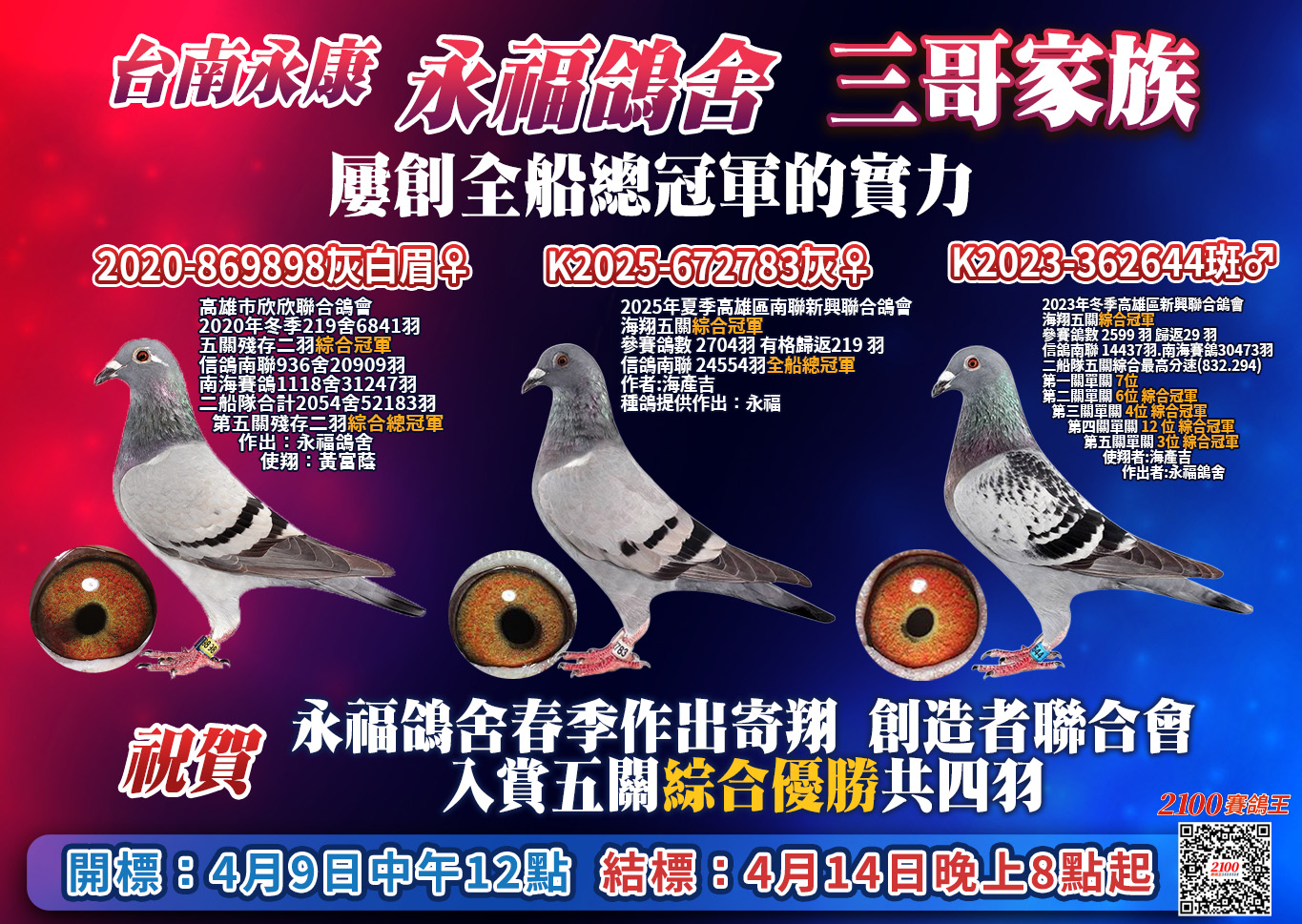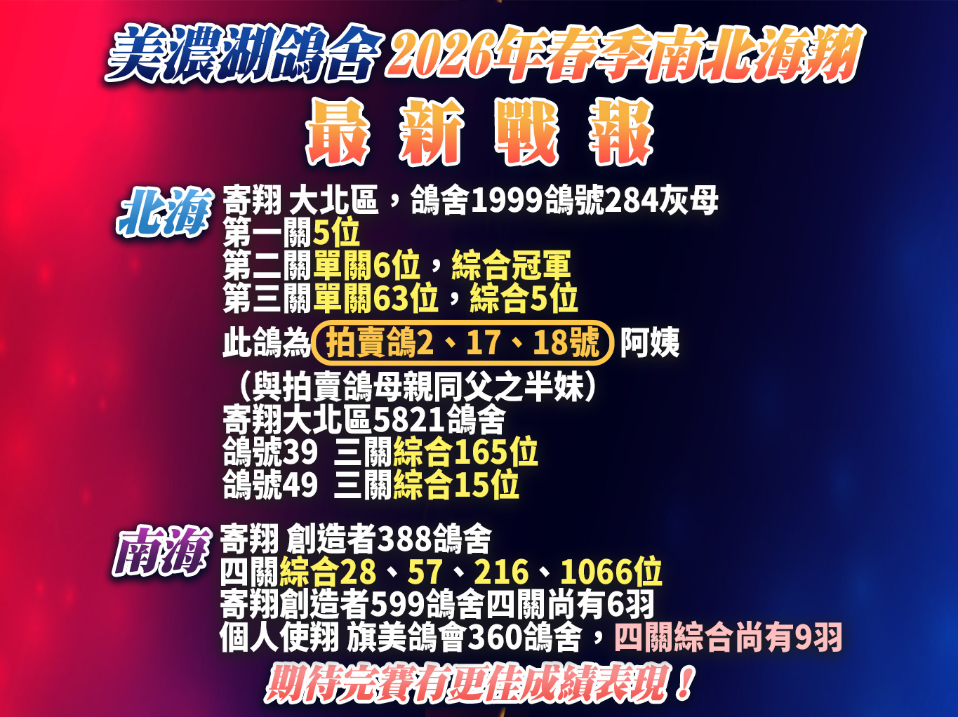 ◉拍賣|【金財神鴿舍】南北海翔常勝強豪|冠軍的創造者→開標:4月23日 中午12點,結標:4月27-29日 晚上8點起