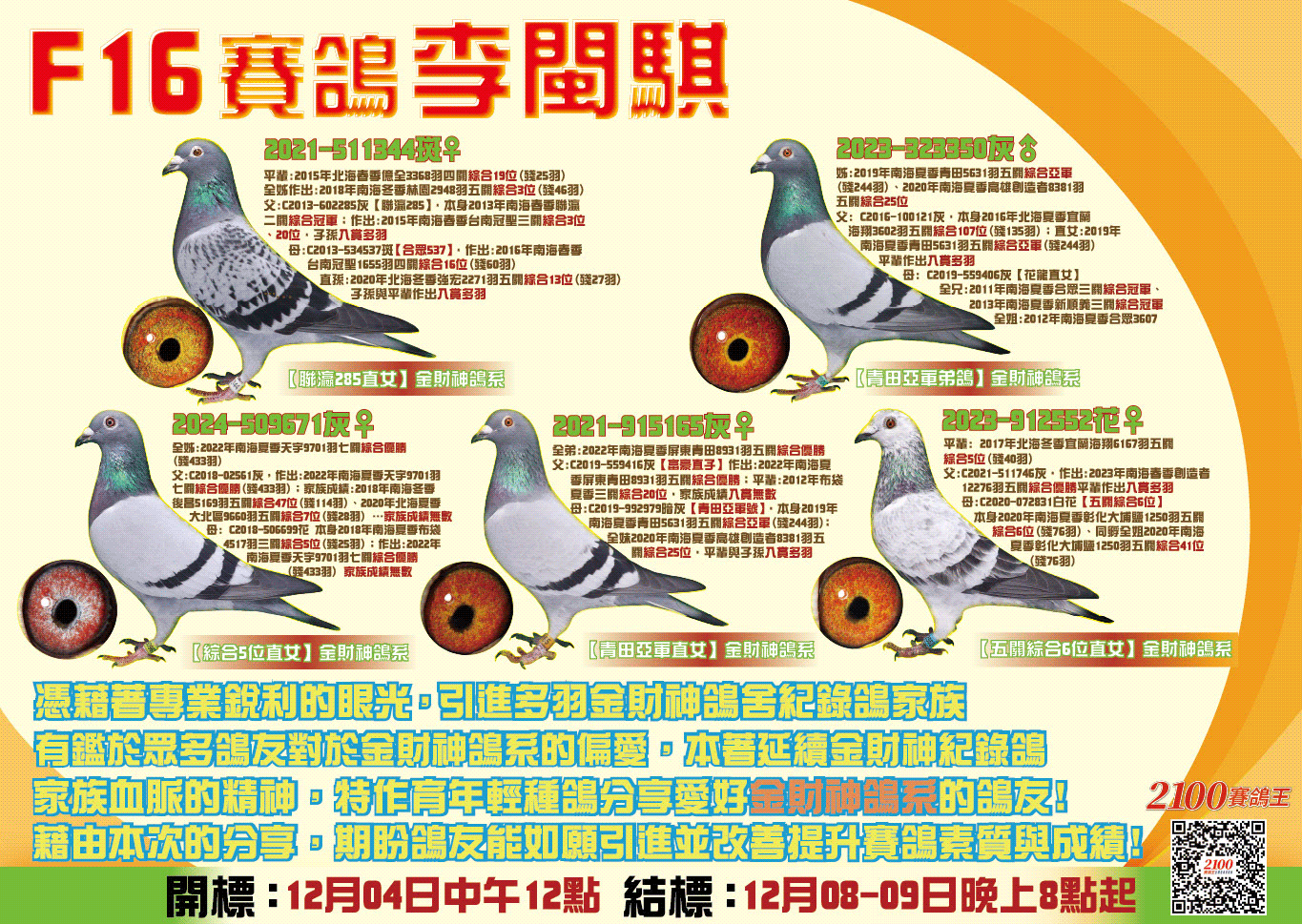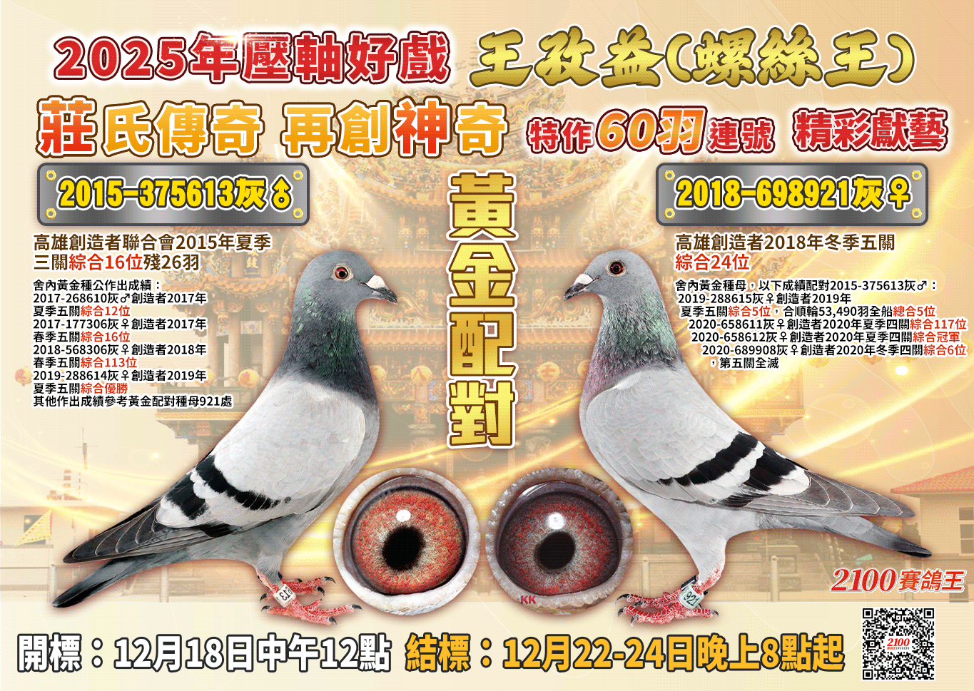 ◉拍賣|【世榮鴿舍】高入賞之“萬達易速步”及100℅極純血勢山系,匯集51-253及51-235血源→開標:11月28日 中午12點開標,結標:12月3-4日 晚上8點起