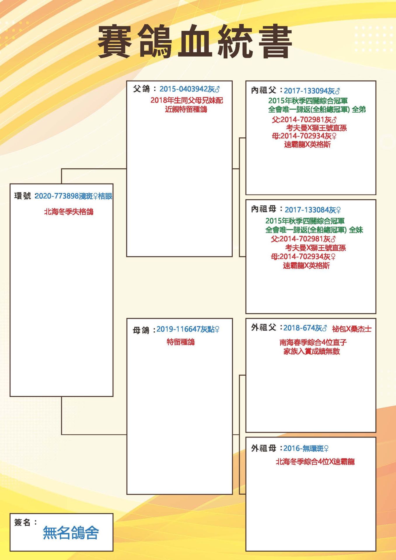 父: 2015-0403942灰♂(2018年生同父母兄妹配近親特留種鴿),父母鴿同為2015年秋季四關綜合冠軍、全會唯一歸返(全船總冠軍)之全弟妹