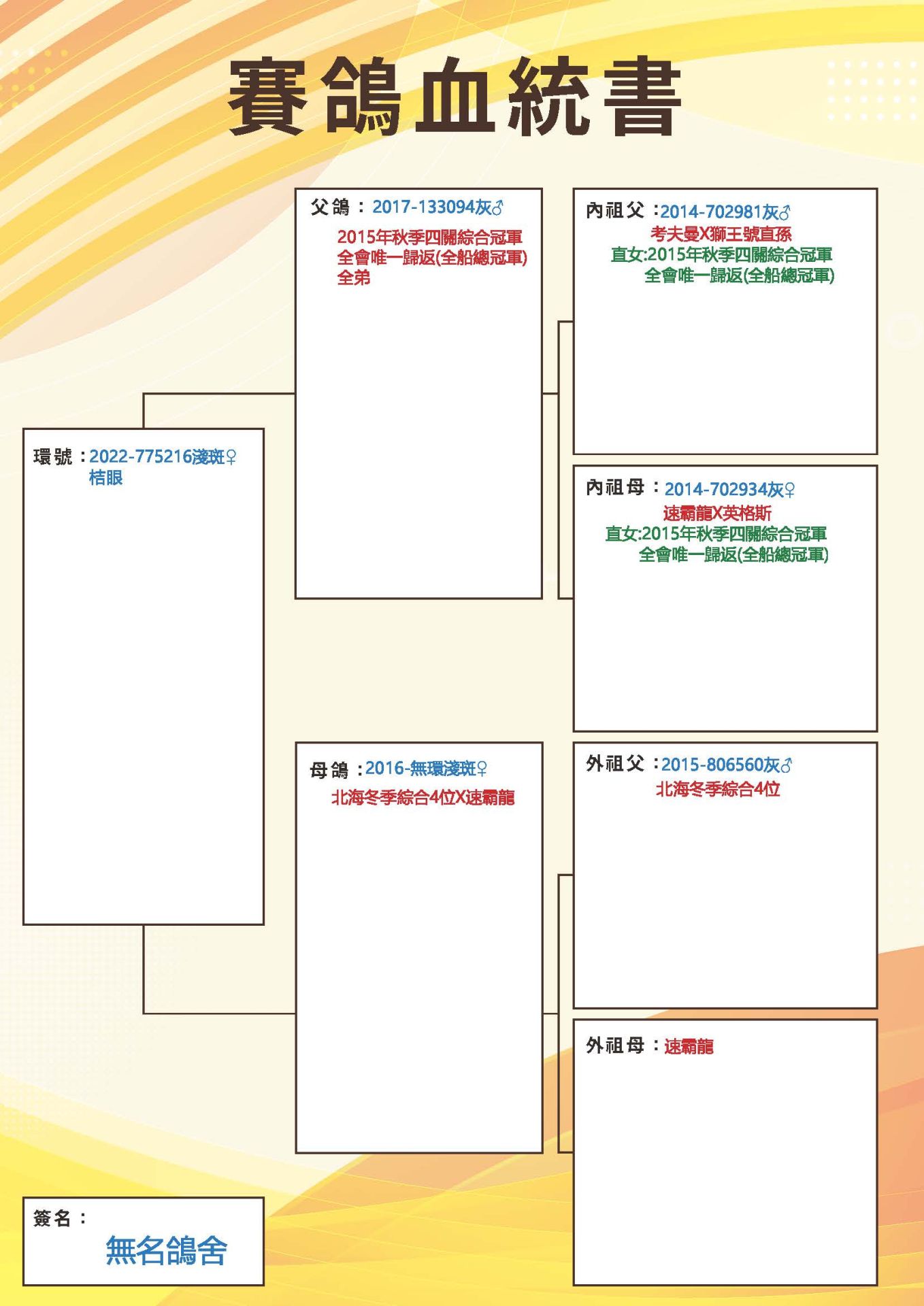 父: 2017-133094灰♂2015年秋季四關綜合冠軍、全會唯一歸返(全船總冠軍)全弟