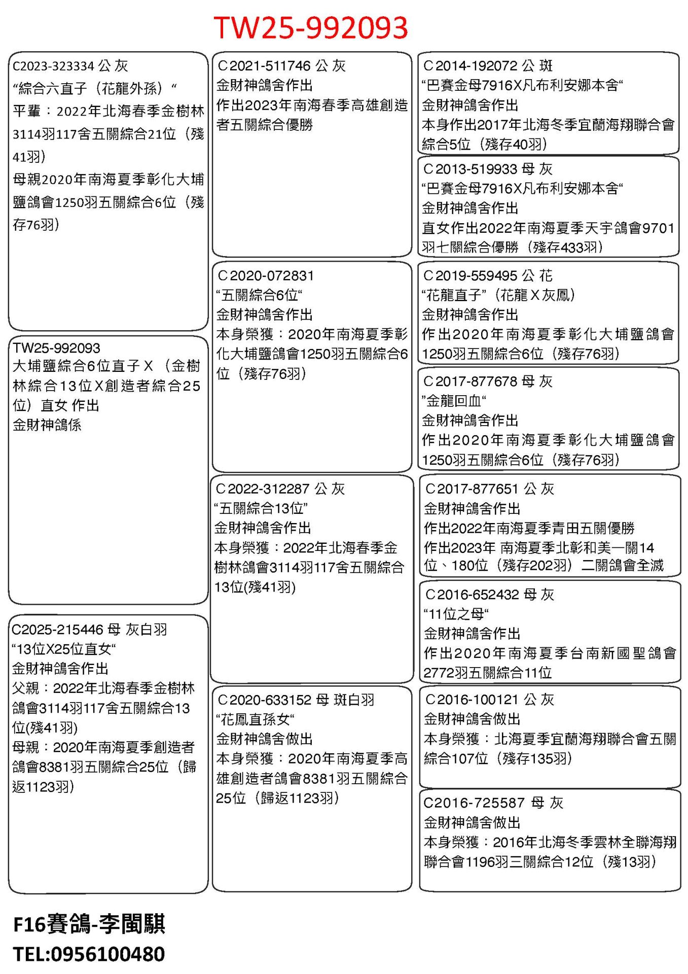 ⼤埔鹽綜合6位直⼦X(⾦樹林綜合13位X創造者綜合25 位)直女 父:2023-323334灰2020年南海夏季彰化⼤埔鹽鴿會1250⽻五關綜合6位(殘存76⽻)直子